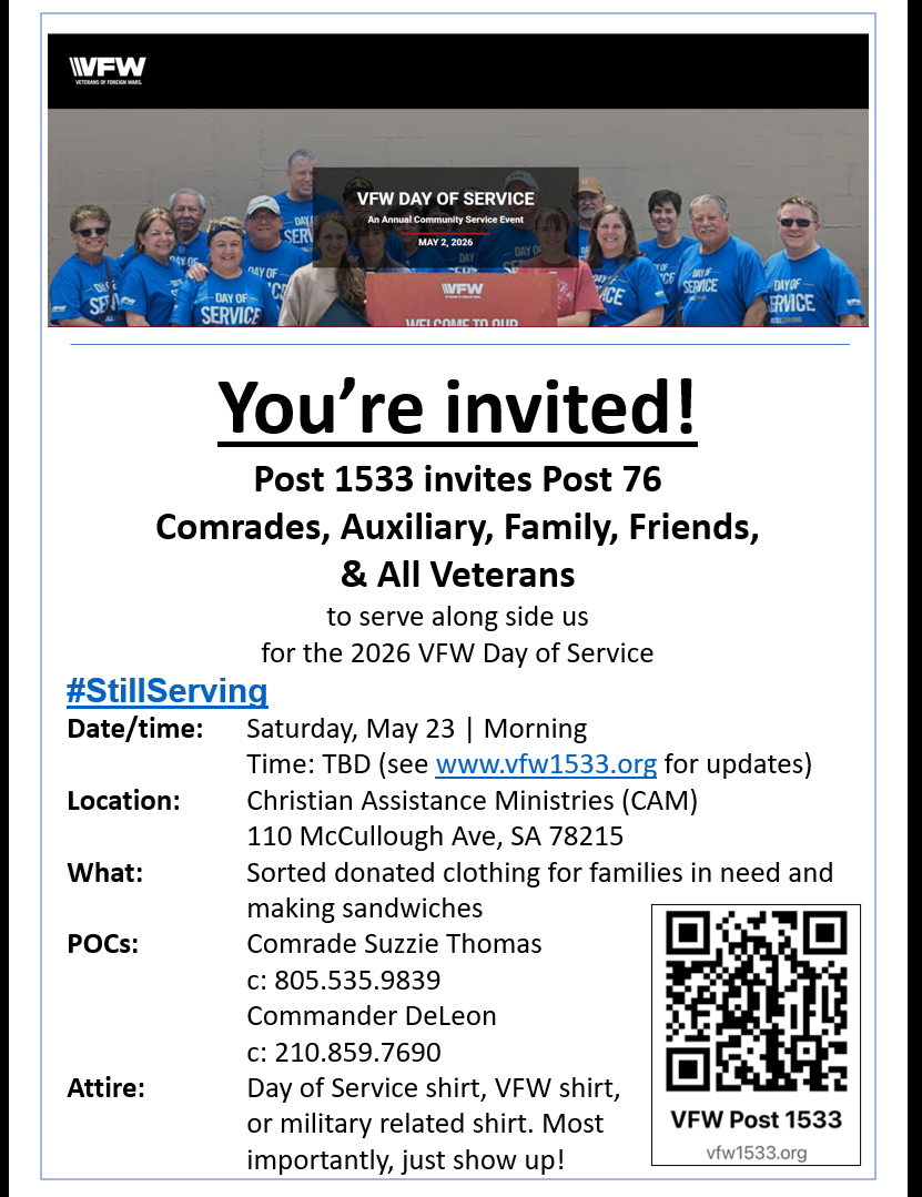 Day of Service shirt, VFW shirt, or military related shirt. Most importantly, just show up!